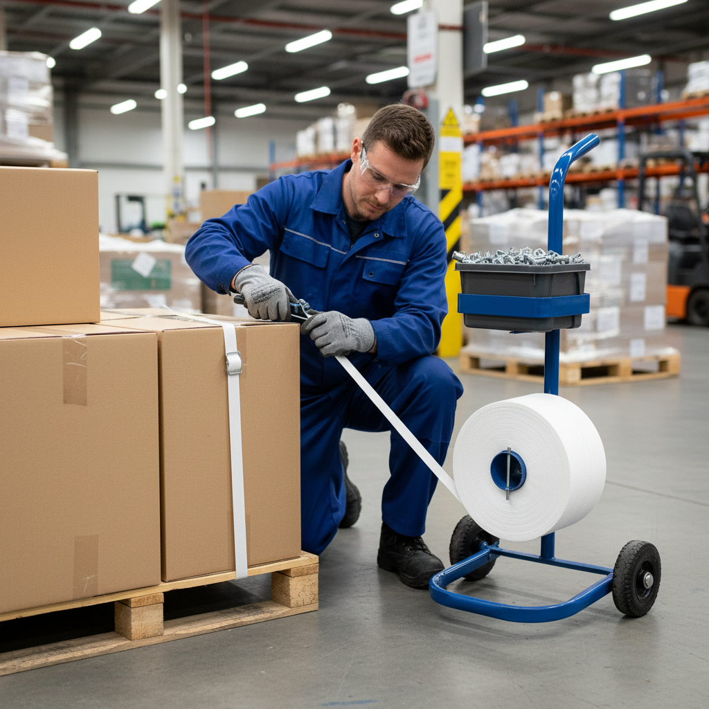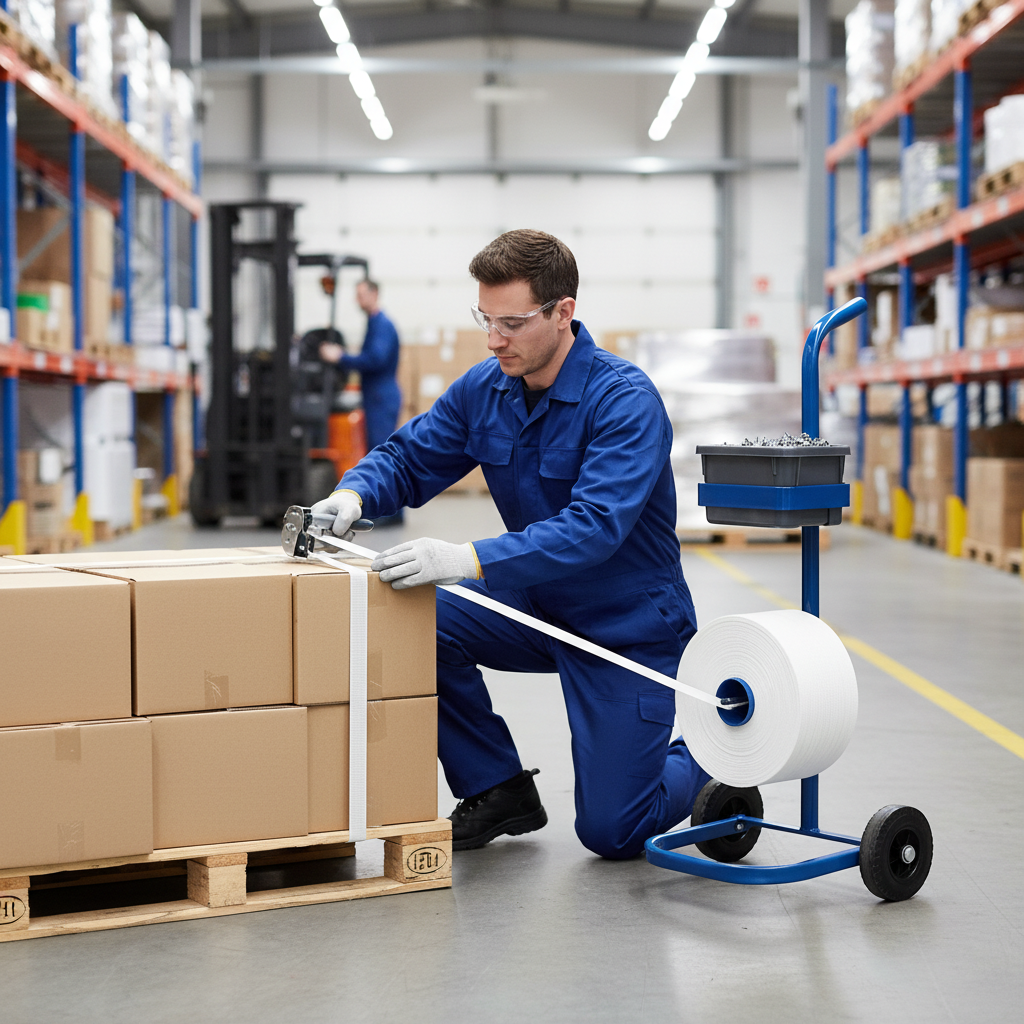To use the mobile dispenser, simply place your woven polyester strapping on the stand, ensuring it is securely positioned. The buckle holder tray allows for easy access to buckles, streamlining the strapping process.