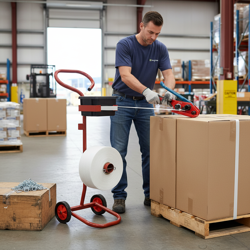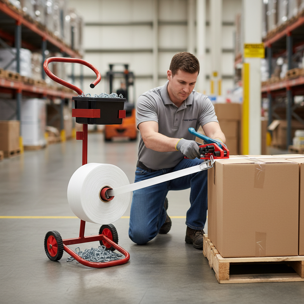 This Professional Woven Polyester Strapping Kit includes essential tools for secure packaging. It features a Heavy Duty Mobile Strapping Dispenser, a Tensioner, and 1000 Metal Buckles, making it ideal for various applications.
